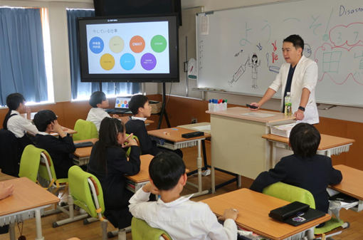 そしていよいよ「ある時は呼吸器内科医、あるときはDMAT隊員!何もない場所でも役に立てる医師になるには!」という授業が始まりました。前半の授業は、呼吸器内科医の仕事内容や肺の病気などを分かりやすく説明していただきました。