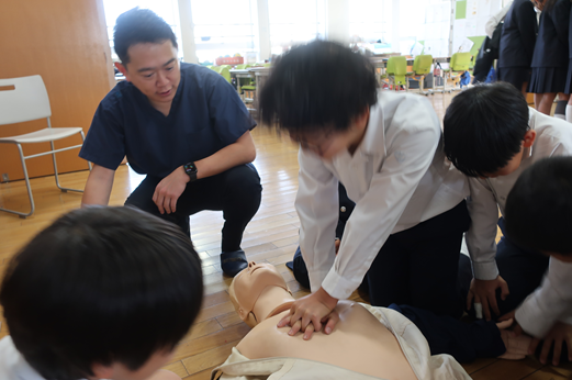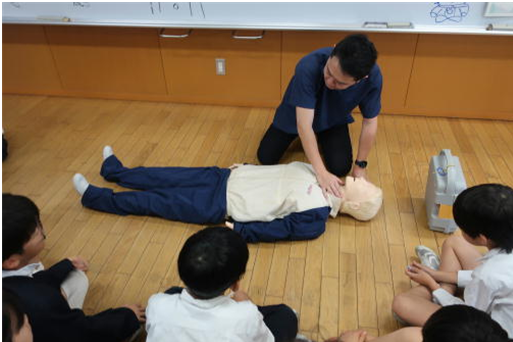 後半の授業は心肺蘇生の体験学習で、ここでも担任を心肺停止の患者役にし、リアルな現場を再現することから始まりました。蘇生方法も分かりやすく説明され、子どもたちは一所懸命に取り組んでいました。田嶌先生が言われた「心肺蘇生をするのはあなたです。勇気をもって実施して下さい。」という言葉は、大人だけではなく、子どもたちの心にも響いたはずです。