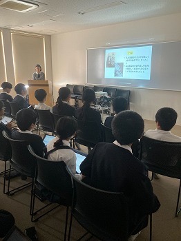 1時間目は、原野さんの普段の学校生活、自分のルーツ、原爆について、国連での印象的だった出来事、平和な社会にするにはどうすればよいのか等、プレゼンテーションしていただきました。国連という場では、国力に関係なく、平等に意見交換がなされている場面が印象的だったという話を聞きました。そういった体験から「対話が大事」だと原野さんは考えたそうです。