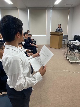 例年、未来予想図では社会人の方にご自身の職業についてお話していただきますが、今回は、高校生の原野さんに講師をしていただきました。原野さんは、ご自身が被爆4世で、平和について関心があり、今年度、高校生平和大使に選ばれています。スイスにある国連本部に派遣されるなど、特別な活動をされています。また、5年生は国語の授業で「たずねびと」という、広島の原爆に関する物語文を2学期に学習しています。戦後80周年という節目の年でもあり、子どもたちの興味もあるので、今回、原野さんのお話を楽しみにしていました。