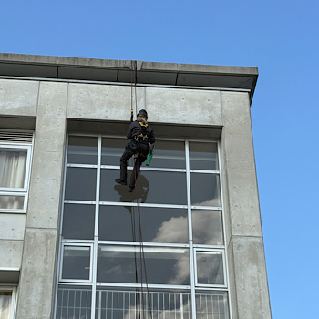 2時間目は、実際の清掃作業を実演してくださいました。校舎の屋上から、わずか2本のロープで降下して窓を磨く姿に、子どもたちは目を離せませんでした。屋上には固定できる設備がない場所でも、専用の道具を使って安全に作業できることを知り、驚きの声が上がりました。着地後は、使用する道具や工夫についても紹介していただきました。