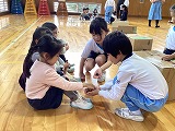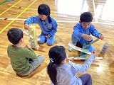 11月19日水曜日に、1年生とマリアの園幼稚園年中組さんとの交流『はじめのいっぽ』を行いました。1年生は生活科で、どんぐりやまつぼっくりを使った「秋のおもちゃ」を作り、幼稚園のお友だちを招待して、秋のおもちゃで遊んでもらう計画をしました。作ったおもちゃは、【どんぐりごま】【まつぼっくりけん玉】【どんぐりころがし】【どんぐりボウリング】などです。おもちゃ作りの学習だけでなく、どのようにしたら年中組さんのお友だちが楽しく遊べるかを考えて、グループで話し合いを重ねてきました。