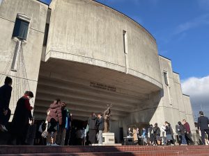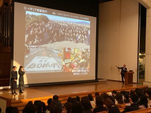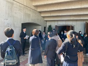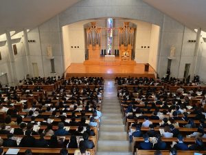 まず始めに、コルベ講堂にてパイプオルガンによる歓迎演奏を聴いていただきました。学校長挨拶では、お互いを大切に想い、平和を願う、本校の建学の精神〝和と善〟についてのお話がありました。