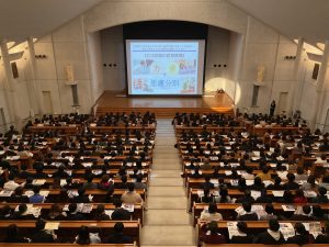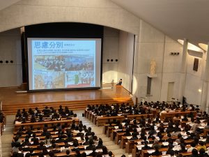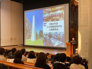 学校長挨拶では、お互いを大切に想い、平和を願う、本校の建学の精神〝和と善〟についてのお話がありました。キリストの教えである隣人愛を学び、心を開き、自分の優しさを苦しんでいる人に分け与える愛を持った人になってほしいと伝えられました。そして、入試説明会を得て本校の学びや優しさを体感していただきたいというメッセージが送られました。