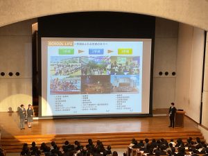 また、学校生活の説明では、高校3年生の2人が登壇し、教員と対話形式で学校の魅力を紹介してくれました。学院祭で模擬店を出店し、大盛況だった時のエピソードや、企業と連携して取り組んだ探究授業で発表した内容、短期留学で得た英語教育と海外の生活についてなど、実際に学校生活をおくる中でのリアルな感想を紹介してくれました。美術部が体育祭でリレーをしながら描いた作品も発表され、生徒会の経験のある生徒は、学校行事を先生の指示ではなく、自ら企画し実行していく面白さや難しさについて話してくれました。