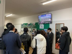 入試説明会の受付業務や学校案内は、高校1年生から3年生までの在校生スタッフで行います。元気な掛け声と笑顔でご案内をしていました。