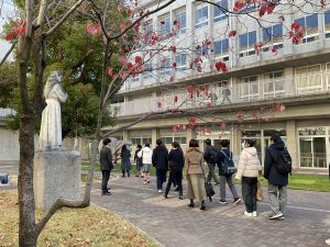 本校はカトリックミッションスクールということもあり、キリストの降誕を祝うクリスマスを大切にしています。校舎には少しずつイルミネーションなどの飾り付けが始まっていました。説明会が実施されるコルベ講堂前には、華やかなクリスマスリースがご来校の皆様を出迎えていました。