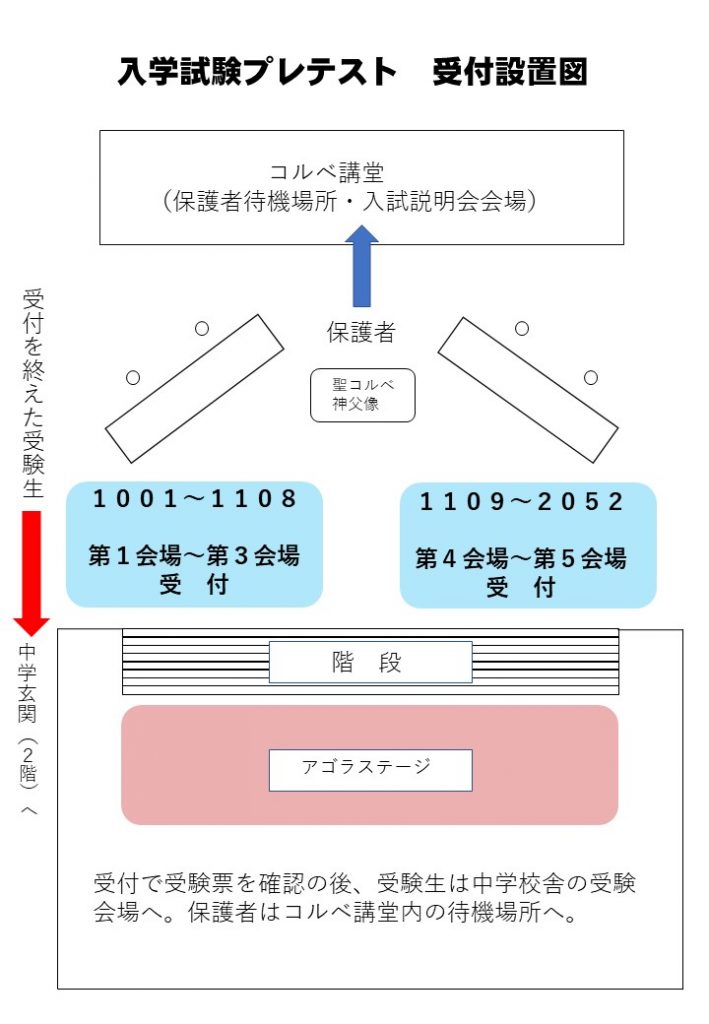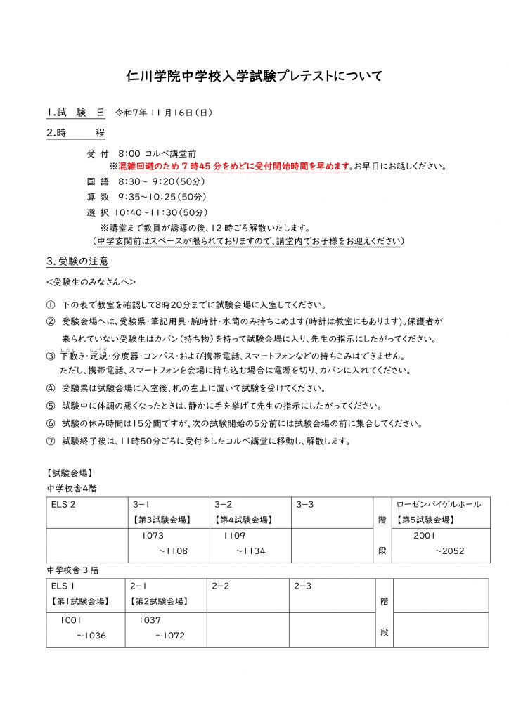 プレテスト当日の、注意事項、試験会場一覧および受付案内図を作成しました。