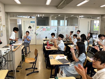 生徒が先生役となって、クラス全員の前で解説をします。全員に分かるように説明するためには、完全に理解しておく必要があります。先生が「完璧。もう補足で説明することはありません」と評価するとクラスみんなから拍手が起こりました。