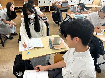 問題を解きながら、席の近い人同士で一緒に考え、教え合って答えを導いていました。自分の考えたことを他の人に説明することで、力が深まります。