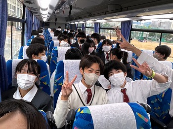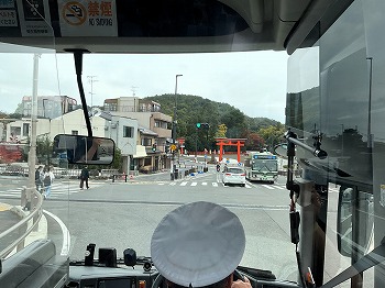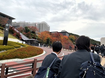 中学3年生カルティベーションコース生約50名が1台のバスに乗って学校を出発しました。行き先は……? バスのフロントガラスに見えるのは大きな神社の鳥居のようですが……。バスを降りてからは、長いエスカレータを2つ上り、さらにスロープを上がって紅葉が色づき始めた丘へ進みます。