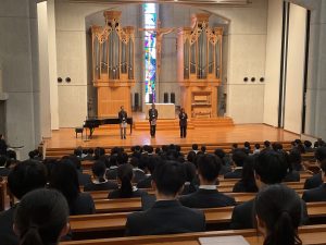 はじめに、校長先生からのお話がありました。校長先生は、国内組・海外組それぞれの研修旅行が持つ意義について述べられ、また神父様として、旅立つ2年生全員に祝福をしてくださいました。