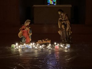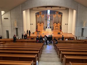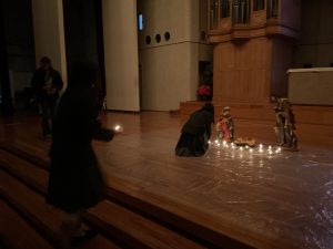 12月18日(金)、クリスマスウィーク3日目の午後、生徒会主催の有志によるイベント「光のつどい」がコルベ講堂にて開催されました。開場準備をしている裏で、生徒会によるFOPという難病のための研究に寄付される「193募金」、父母の会による制服リユース、中学校による『仁川の森』で採れた野菜とドライフラワー石けんの販売がありました。