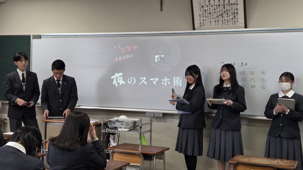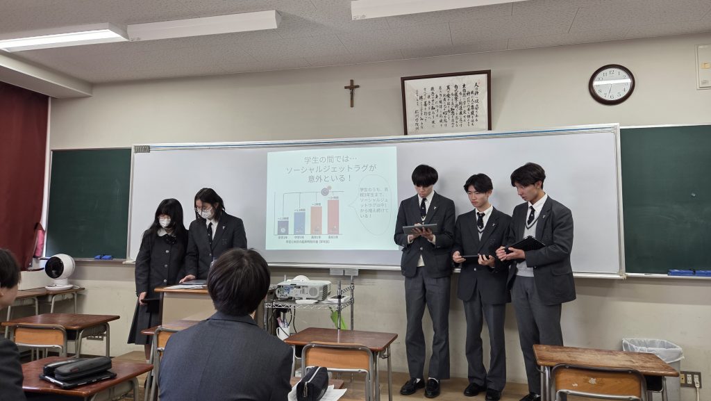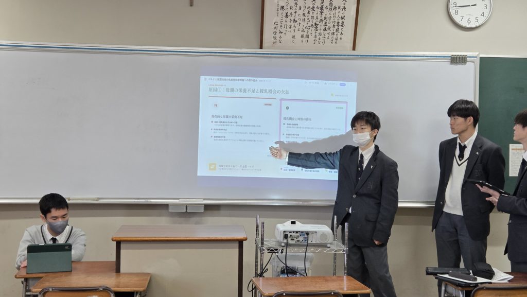 3学期に、高校1年生は同志社女子大学看護学部と連携した「生体リズムと睡眠」がテーマの探究、または2学期に行った探究を深化する地域とつながる社会課題解決探究を行いました。高校2年生は東京農業大学国際食料情報学部と連携した「発展途上国におけるソーシャルビジネスの提案」、および数学Bの授業で行った統計的な推測の探究を行いました。その成果を高校1年生と2年生が交流して発表および質疑応答を行いました。