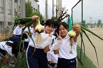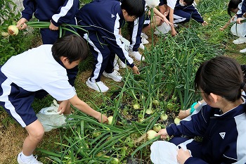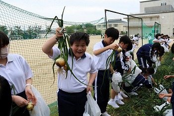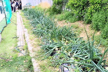 【中学】仁川の森 先輩から1年生へ玉ねぎ収穫のプレゼント