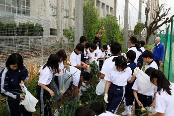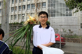 この玉ねぎは、昨年秋の仁川の森の授業で植えました。つまり、今年の中学2年生と3年生、そして高校1年生が「新入生に収穫の喜びを味わってもらおう」という思いを込めて育てました。
