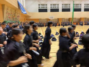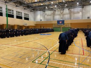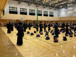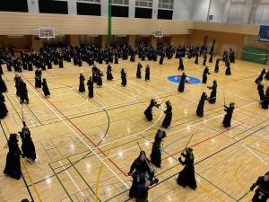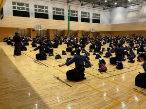4:30に起床し手早く支度を済ませて、防具を抱え体育館に向かい稽古を行いました。大阪体育大学寒稽古の歴史は長く、毎年多くの先生方先輩方、20以上もの団体、中には海外からの剣士まで多くの方が大学に集まります。その剣士たちの人数と、何より大学生の声量に圧倒されながらウォーミングアップのランニング・準備体操が行われました。そのあと、大人数での稽古が開始されました。小学生から大学生、大学OBの方々、教職員、そして学長の先生が参加した、年齢も経歴も関係ない、みんながみんな一人の剣士として、ただただ真剣に剣を交えました。仁川学院の剣士たちも、積極的に大先輩方に稽古をお願いしに向かい精進しました。