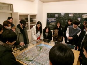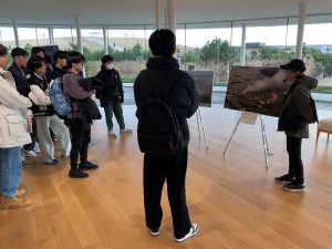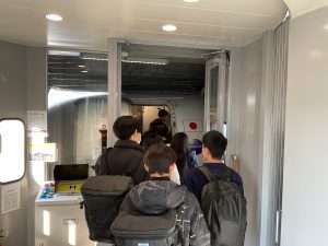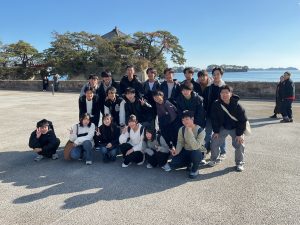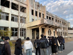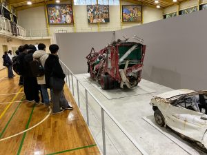 松島を後にしてからは石巻へ移動しました。石巻は2011年の東日本大震災で大きな被害がもたらされた地域の一つであり、生徒たちは震災当時の記憶をなぞるべく伝承館にて震災学習を受けました。動画によるドキュメンタリーなどの観覧・津波や火災の被害を受けた門脇小学校が実際に行った避難・門脇小学校内部や遺族から寄付された遺物、津波によって破砕した消防車、当時の石巻のジオラマの見学等が行われ、とにかく逃げろ・一緒に逃げろというメッセージが強く響きました。
