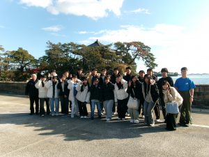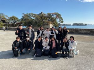 仙台の天気は晴れときどきくもり、天候にも恵まれた1日目でした。バスガイドさんの誘導でバスに乗り、仙台の様子の説明を受けながら目的地 松島まで移動しました。一見、ただ平野が広がっているように見えても建物には波にのまれた痕跡があったり、松の木の防風林が津波によって本数が減ってしまったり、震災の影響は消えてはいませんでした。