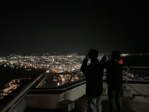 盛岡からは新幹線で青函トンネルを通り函館へ。バスで函館山に移動し、ロープウェイで夜景を楽しみました。函館国際ホテルにチェックイン後、夕食をとりました。