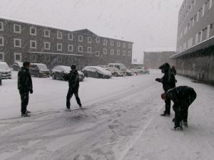 昨日の地震の疲れもあり、長時間のバス移動の中、生徒たちはぐっすりと眠っていました。起きた頃にはパーキングエリアは真っ白な雪景色となっており、今朝までの緊張した表情とは打って変わって、西宮ではなかなか見られない上質な雪に生徒たちは大興奮。トイレ休憩のはずが、すっかり束の間のレクリエーションとなりました。まだまだ地震の心配がある状況でしたが、昨日からの緊張が、この一瞬だけは手に降ってきた雪のように溶けた瞬間でした。