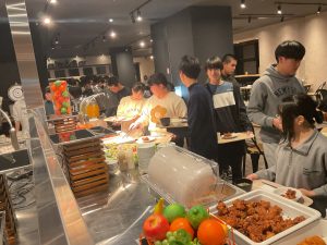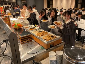 雪遊びで冷え切った生徒たちは、夕食の温かいバイキングで体を温めました。