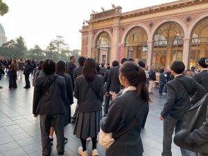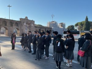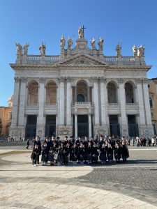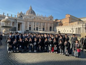 研修第3日目は昨日に続いて天気に恵まれました。本日はバス4台に分乗してサン・ジョバンニ・イン・ラテラーノ大聖堂、バチカンのバチカン美術館とサンビエトロ大聖堂の見学を行いました。私たちのグループは、まずサン・ジョバンニ・イン・ラテラーノ大聖堂を訪れました。壮大な内部には12使徒の彫像や美しい天井画があり、生徒たちはガイドさんの詳細でわかりやすい説明に耳を傾けていました。その後の昼食は生徒たちが自由に付近のお店を利用して食べました。広場に面したお店のテラス席でpizzaを食べるおしゃれな男子3人組、パスタをテイクアウトして広場のベンチで食べる仲良し女子、スップリというローマのライスコロッケなどいろいろ選んでシェアするグループなど、生徒たちは英語を駆使してランチを楽しんでいました。