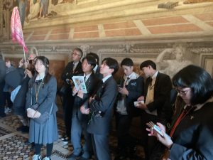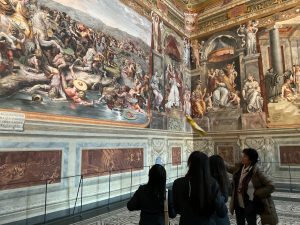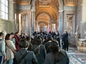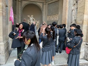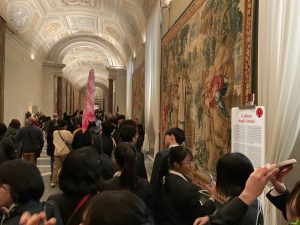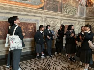 ランチの後はバチカン美術館を見学、ここで国境を越えることになって不思議な感覚です。膨大な展示品をガイドさんの説明を聞きながら見ていきます。後半にはかなり足腰が疲れてきましたが、世界史や倫理の教科書にも載っているラファエロの作品などを見ながら生徒たちは盛んに撮影をしていました。撮影枚数が増えてスマートフォンの容量を心配する生徒もいました。