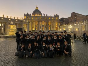 バチカンのシメは何と言っても礼拝堂の天井と壁面に描かれたミケランジェロのフレスコ画です。大塚美術館で見た作品の本物が目の前(上?)にあります。ガイドさんが事前に詳しく見どころを説明してくだっていたので、生徒たちもそれに照らし合わせながらじっくり鑑賞していました。宗教の時間に聖書を習っていたので、描かれた場面のことがよくわかると言っていた生徒の言葉が印象的でした。徒歩で国境を越えて、最後の見学地サンピエトロ大聖堂ではその壮大で美麗な内部装飾に圧倒されました。見学を終えるとすでに黄昏の時間となり、冷え込んできました。美しくライトアップされた大聖堂をバックに記念撮影をしてバスでホテルに向かいました。