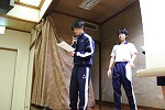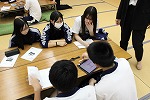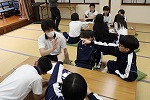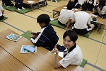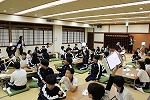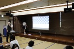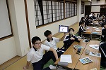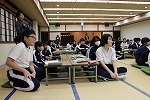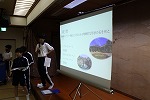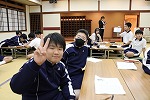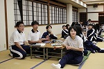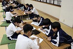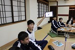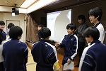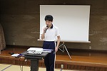夕食の後、入浴を済ませ、事前学習の成果を班別で競い合う、クイズ大会が行われました。司会、裏方には、生徒自ら手を挙げて立候補してくれた、有志の皆さんに協力をお願いしました。皆さんのおかげで、大盛り上がりとなりました。明日の自主研修に向けて班員と協力する姿が見られました。
