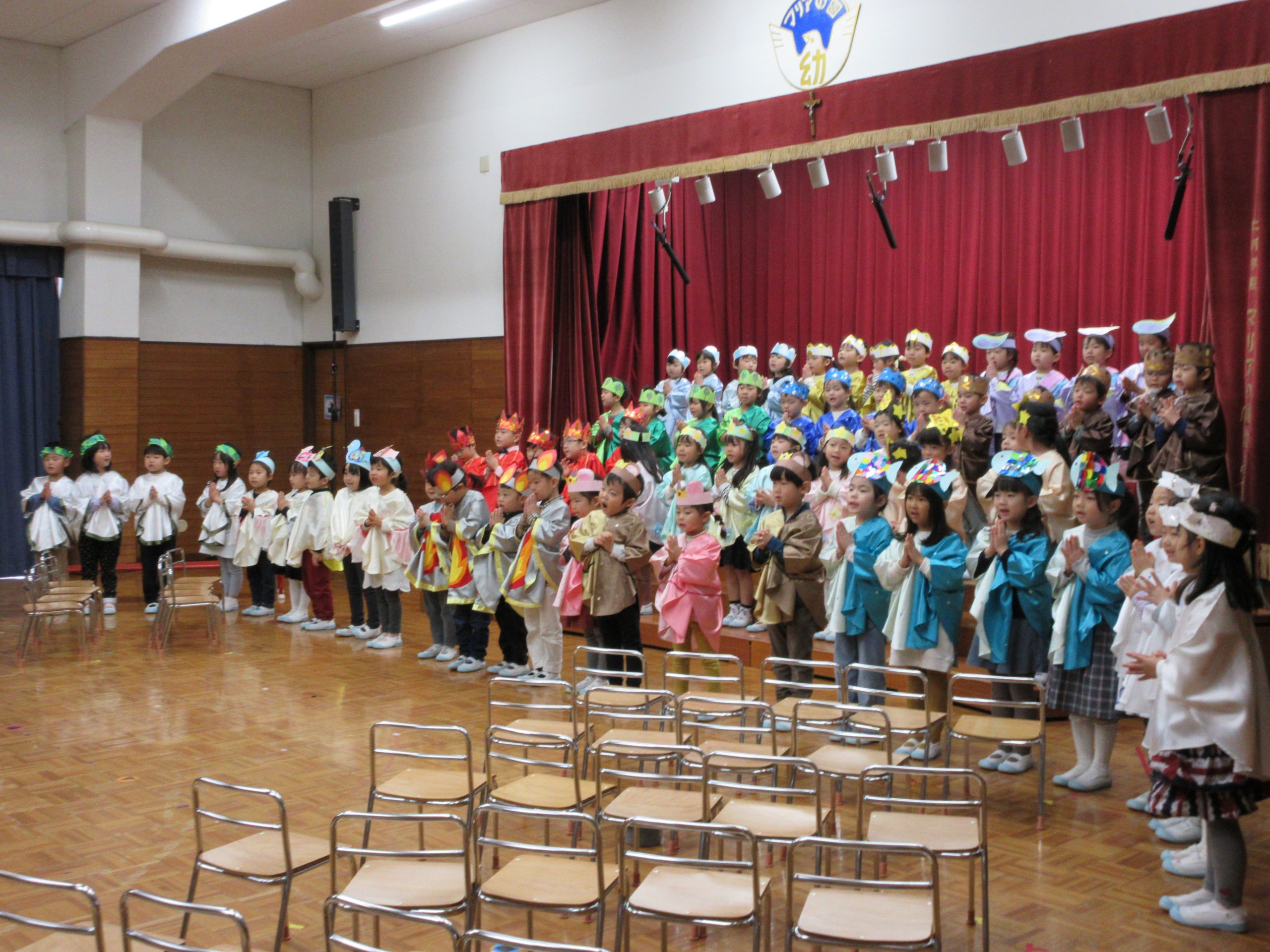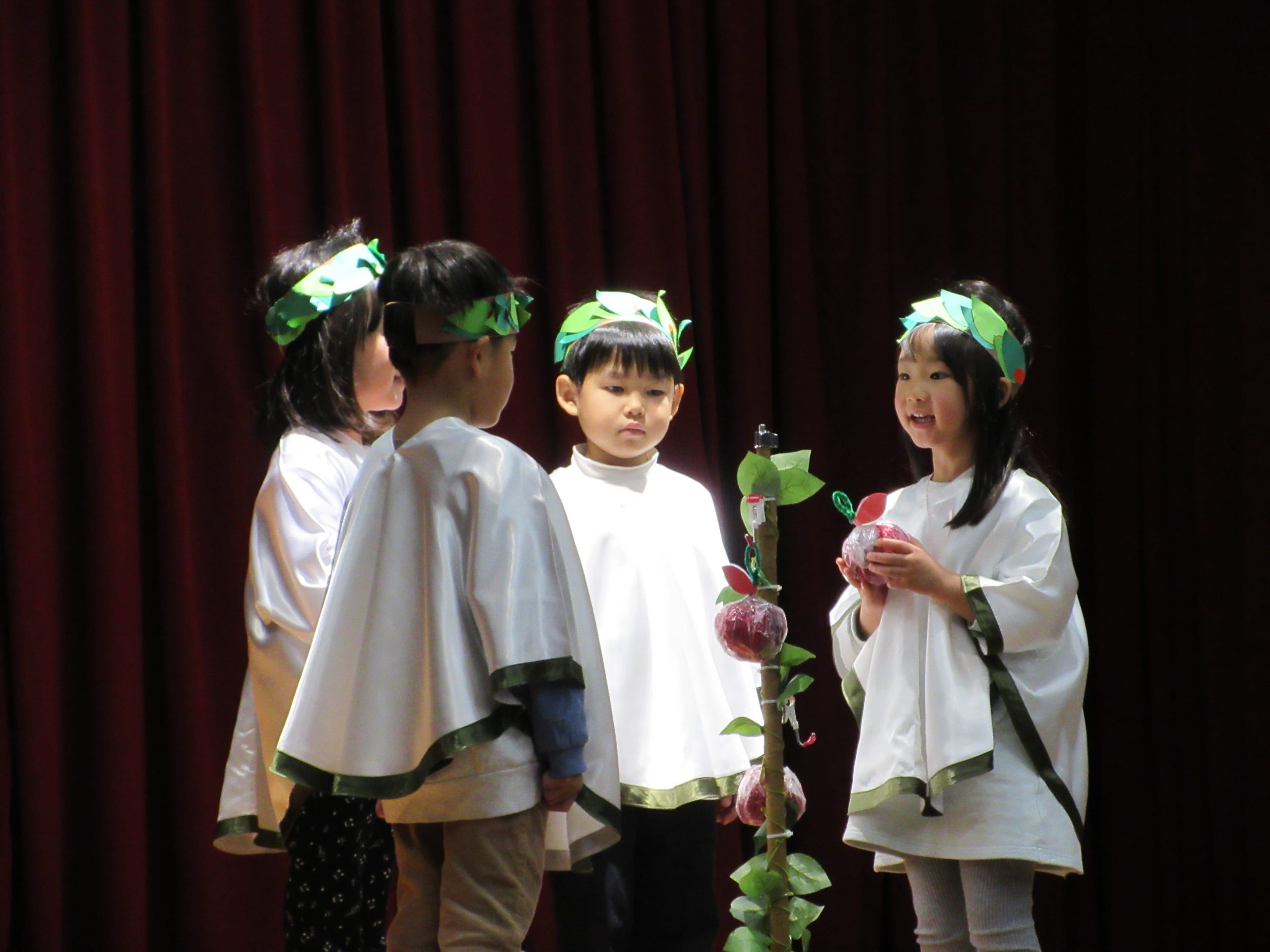 聖劇の練習をとおして、他クラスのお友達との関わりも深まりました。昨日よりももっと上手に演じよう、もっと姿勢を正して座ろうと努力をした子どもたちの姿を、神さまも見守ってくださっていたと思います。