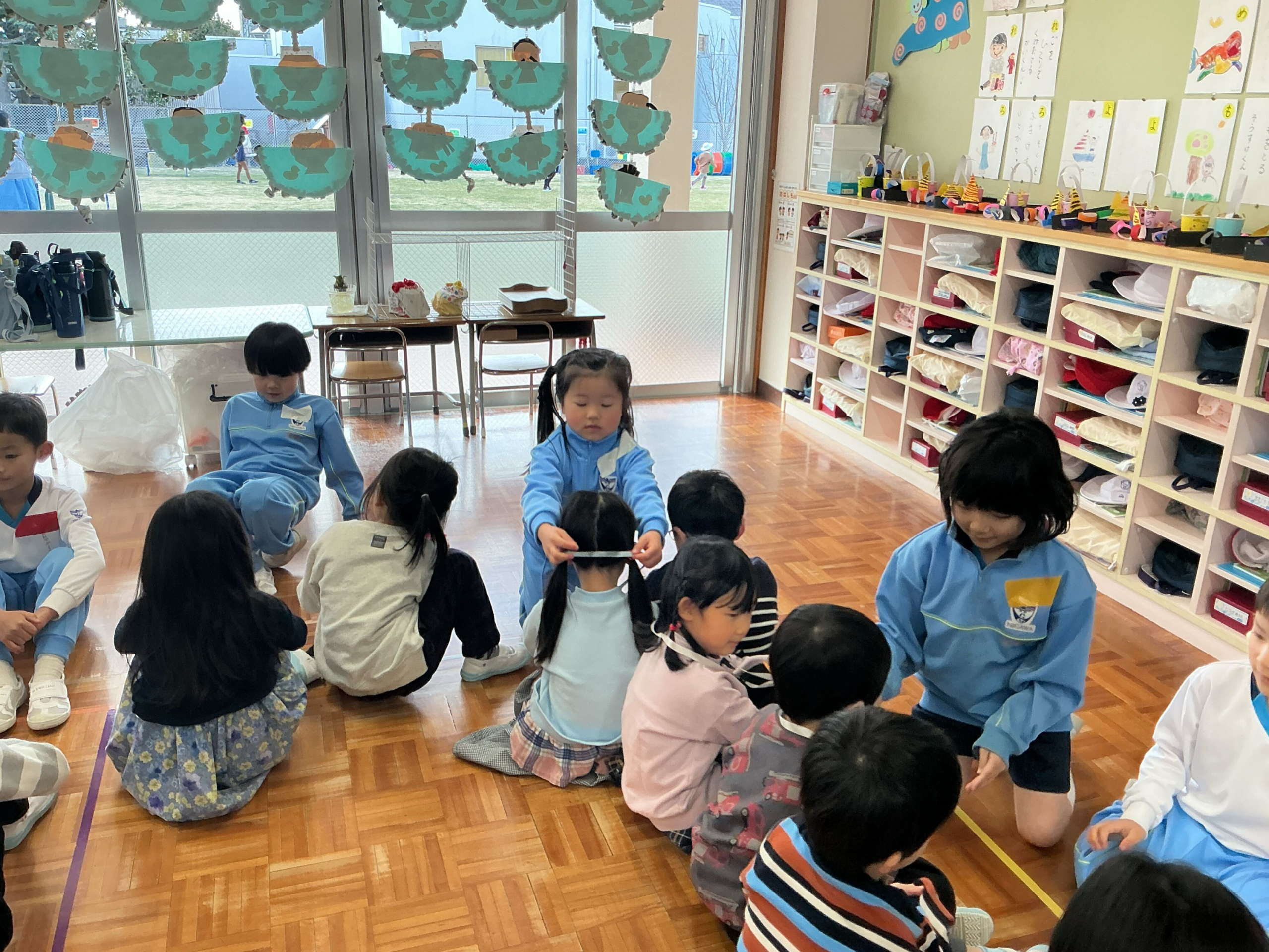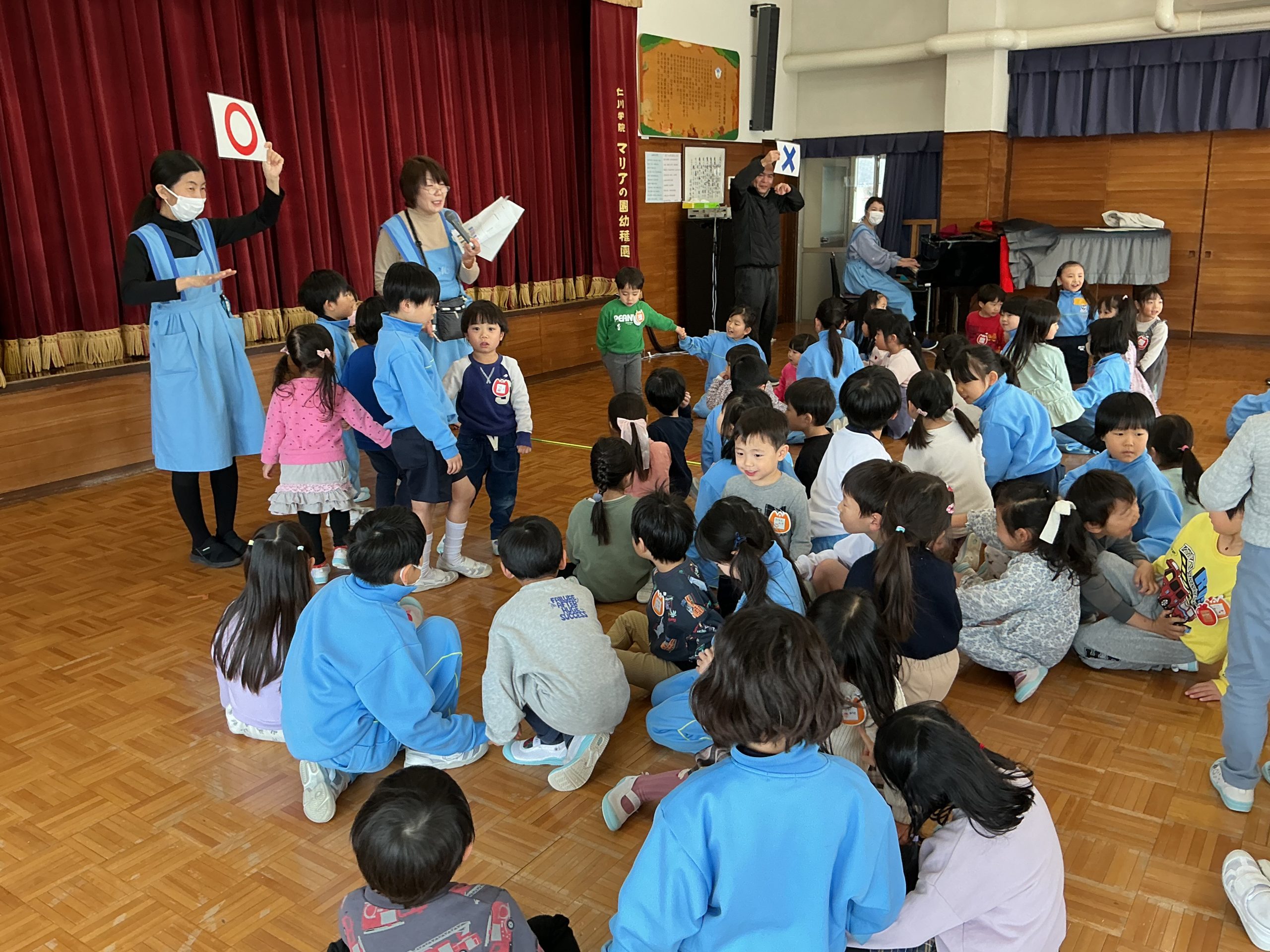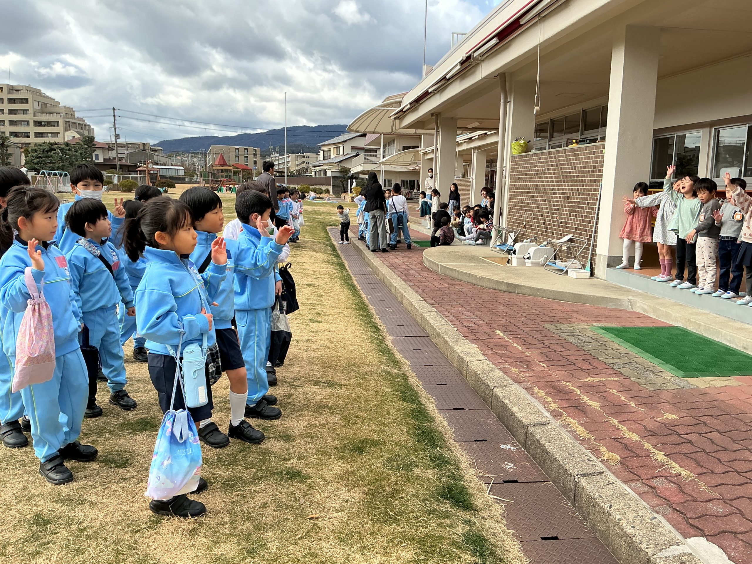 ホールに集まって〇✕クイズもしました。ペアで協力をして答えがどちらかよく考えている様子が見られました。楽しい時間はあっという間に過ぎ、別れが名残惜しく「さみしいな」「また遊ぼうね!」と小学生が見えなくなるまで手を振っていた子どもたち「あんなお兄さん、お姉さんになりたい」と憧れの気持ちと、小学生になることへの期待が膨らんだようです。