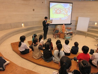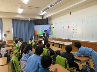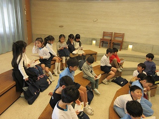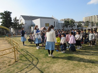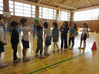 今回は3つの場所で小学校体験をさせていただきました。教室での国語の授業では、数には色んな数え方があることを学び、グロッタの聖堂では、宗教のお話を聞きました。先生が紙芝居のくまさんのお話をとおして「大変なこともあきらめずに頑張ってみよう」「困っている人を助けよう」という大切なことを教えてくださいました。体育館では体育の授業です。ペアのお友達と力を合わせて、ボールを転がしたり運ぶリレーをし、チームのお友達と頭の上からと股の間から大きなボールを渡していく遊びも楽しみました。