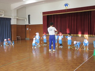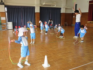 縄の持ち方を確認して、腕を大きく回して縄を跳び越える練習もしました。