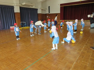ボールを、前にいる友達に投げてキャッチ。うまくできた時は、嬉しそうな表情が見られました。