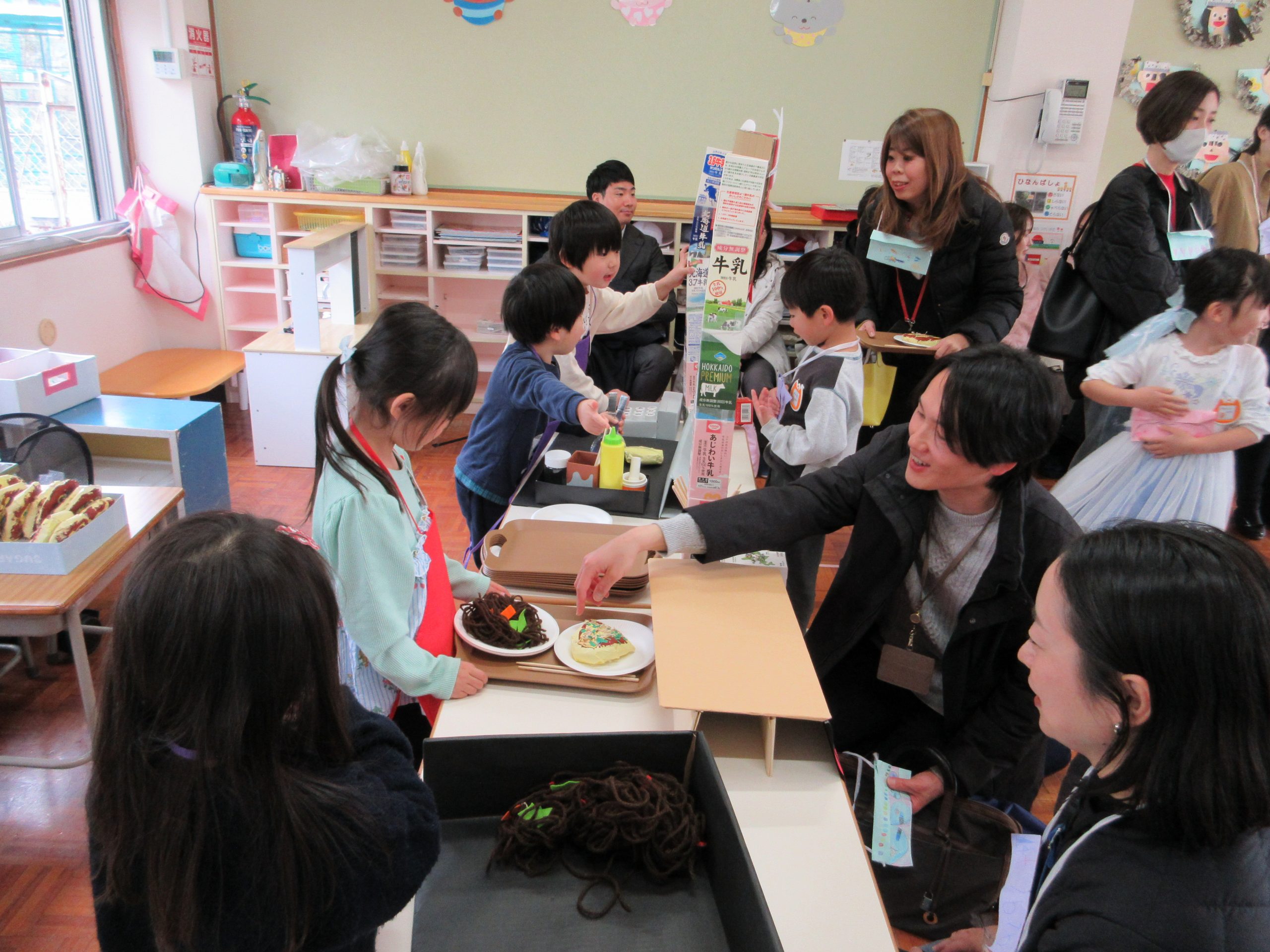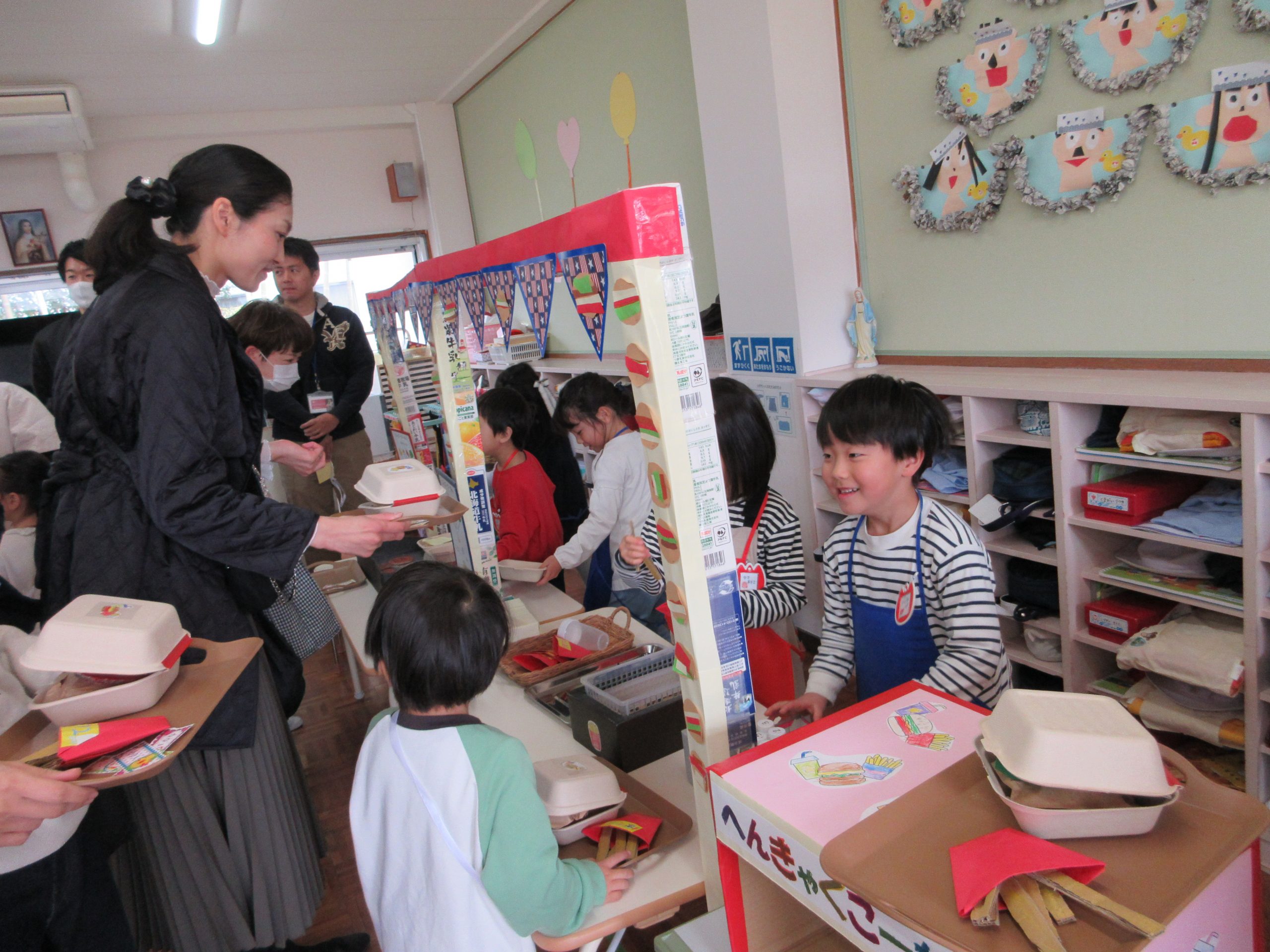 みんなのお家の方が来てくださって、いつも以上に商売繁盛でした。たくさんのお客さんを相手に、「忙しいなー!」と言いながらもテキパキと動き、楽しんでいる様子でした。お家の方にも頑張っている姿を見てもらうことができて、子どもたちも達成感があったようでした。