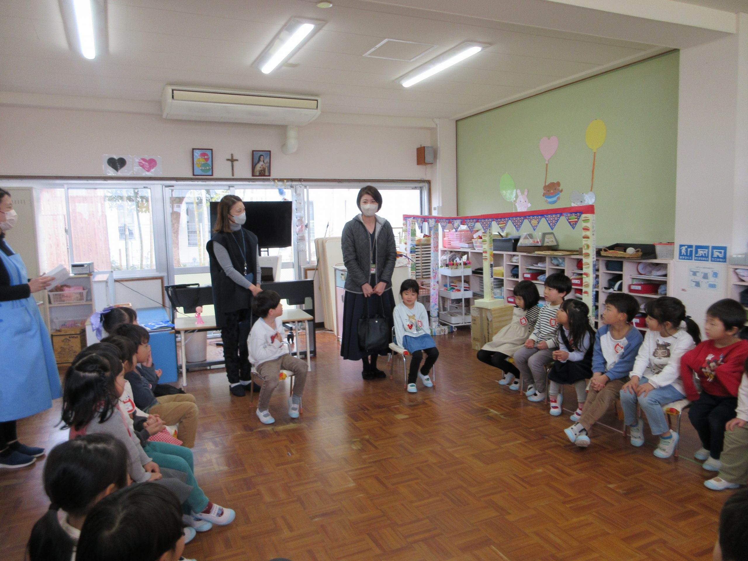 この保育参観で、お友達同士で話し合いをしながら役割を決めたり、自分のお仕事に責任をもってしている姿をみていただき、成長を感じていただけたと思います。