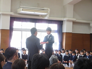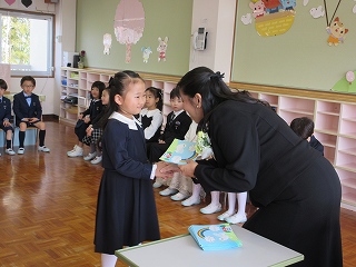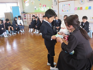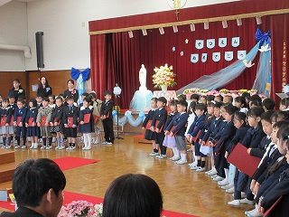 ホールへ移動し、卒園式が始まりました。舞台から堂々と入場してくるみんなの姿がとても晴れやかです。お祈りをし、園歌を歌い、園長先生から卒園証書を受け取りました。