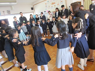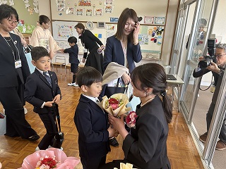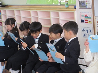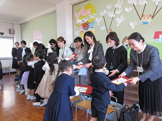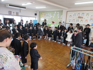 「お別れのことば」で、幼稚園での思い出や、おうちの方と先生たちへの感謝の気持ち、そしてこれからも「あいしあい・たすけあい・ゆるしあう」ことを忘れずに歩んでいくことを伝えてくれました。最後は、お別れの歌「忘れないよ」です。この歌は、前園長先生が、子どもたちの為に作ってくださった特別な歌、子どもたちのまっすぐな歌声に、みんなが小さかった頃の姿が思い出され、今日の立派に成長した姿と重なり、保護者の皆さんと職員の目に涙が浮かびました。