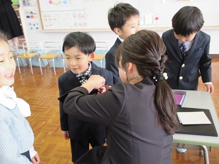 式が始まる前に、担任の先生からマリア様のメダイをつけてもらいます。メッセージカードを受け取り嬉しそうに読む子どもたち、先生が一人ひとりを大切に思う気持ちが伝わったようです。