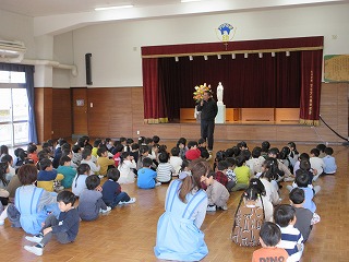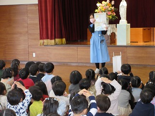 今日はホールに集まり、修了式が行われました。一年間の子どもたちの成長を見守ってくださった神様に感謝の祈りをささげて、「マリアさまのこころ♪」をみんなで元気な声で歌いました。そして、一年間よくがんばった子どもたちに、先生から楽しい出し物がありました。
