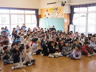 そして、園長先生からは一年の成長の振り返りと、今年度をもって退園する4名の子どもたちの紹介がありました。いっしょに遊んでくれた4名のお友だちへ、みんなから「ありがとう~、元気でね!」の言葉をかけ、退園する子どもたちからも「ありがとう」の感謝の言葉を伝えることができました。淋しい限りですが、新しい所へ行ってもお友だちをたくさんつくって、元気に過ごしていってほしいと思います。