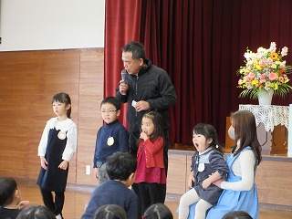 そして、園長先生からは一年の成長の振り返りと、今年度をもって退園する4名の子どもたちの紹介がありました。いっしょに遊んでくれた4名のお友だちへ、みんなから「ありがとう~、元気でね!」の言葉をかけ、退園する子どもたちからも「ありがとう」の感謝の言葉を伝えることができました。淋しい限りですが、新しい所へ行ってもお友だちをたくさんつくって、元気に過ごしていってほしいと思います。