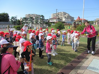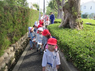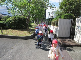 空も澄んで、すっかり秋らしくなってきました。年少組のみんなで、初めての園外保育にでかけました。