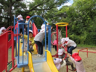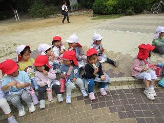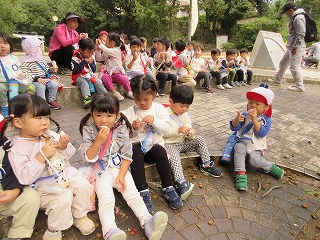 公園に着いたら、みんなでおやつを食べました。たくさん歩いたので、美味しかったね。