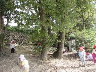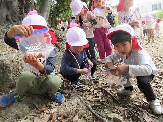 中谷公園には、大きいものや細いものなど、いろいろな種類のどんぐりがたくさん落ちていました。「こっちにもあったよ」などと嬉しそうに集めて、自分のバッグに入れて大切に持ち帰りました。